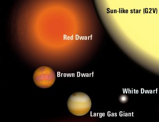 SPECTRAL CLASS: A star's spectral class depends on the temperature, and thus basically upon its mass. More massive stars are hotter. But more massive stars are also less common. Spectral classes are subdivided into numeric distinctions from 0 to 9, where a star with 0 is hotter than one with 9. O: These very massive blue stars are also very rare. One of the closest to Earth is Mintaka in the belt of Orion, almost 1000 LY away. B: Blue-white massive stars. B-stars are also uncommon. One of the closest to Earth is Alpha Gruis, slightly more than 100 LY away. A: White stars. Sirius, Vega and Altair are of this type. F: Yellow-white stars slightly larger than the Sun. Usually considered the most massive stars capable of harboring Earth-like life. G: Yellow stars. Our sun is class G2, while Alpha Centauri is G0. K: Orange stars. They are less massive and cooler than the Sun. Epsilon Eridani is a typical example. M: Small red stars often called red dwarves. They are very common and faint. Proxima Centauri and Barnard's Star are typical. Some very cool red stars are "L"-class, and these could well be brown dwarves or their close relatives. SPECIAL STELLAR TYPES White Dwarves: These are very dense, hot and small (in size, not mass) stars which are formed from old stars. White dwarves are common - about 10% of all stars. A young white dwarf is very hot but it gradually cools off, so the surface temperature indicates age of the dwarf, not primarily mass. Interestingly enough, the more massive a white dwarf is the smaller it also is. Very young white dwarves are among the hottest stars known, but that phase is fairly short. White dwarves don't have habitable planets, but it is possible that distant cold worlds could survive the stellar evolution. The closest white dwarf to the sun is Sirius B. Brown Dwarves: "Stars" which are too small to ignite stellar fusion in earnest. They range in size from 0.013 to 0.08 solar masses. They have a brief period of deuterium burning, but after that generate energy by gravitational contraction. Brown dwarves are cooler than real stars and they, like white dwarves, cool off with time. Young brown dwarves are substantially brighter and hotter than the older ones found. Unlike planets, brown dwarves can be formed separately, like stars. (Sometimes "brown dwarf" is used for all objects larger than 1.5 Jupiter masses and below 80 Jupiter masses, but here the term is limited to the bigger objects that can form independently). Brown dwarves radiate infrared heat much more than visible light. In radius, brown dwarves are probably smaller than Jupiter, or about as large - despite being more than ten times more massive. This may seem strange, but the gravitation of a brown dwarf is enough to compress it to much greater densities. (And small red stars are much denser than the Sun - or the Earth for that matter). Few brown dwarves have been found, but they are believed to be common though hard to detect. Wolf-Rayet Stars: These are O-class stars which seem to have a gas envelope. Such envelopes are also sometimes found around B-stars and is probably ejected from the star. Coal Stars: Spectral classes R, N and S are uncommon very cool stars. C-stars (carbon stars): Of spectral types R & N, these stars seem to be rich in carbon and carbon compounds. Many are found in the Magellanic clouds, where they are more common than in our galaxy. C-stars roughly conform to G4-M9 spectral classes in terms of size. S-stars: These are usually very cool red giant stars with an abundance of zirconium oxide and lantanum oxide. Peculiar A-stars: These A-class stars have very strong absorbtion lines of metals. Flare Stars: These are M-class stars (ranges M3 to M9) which periodically increase in luminosity by 1d10 x 50% for a short time. About half (1-5 on 1d10) of all dim red stars may be flare stars. The increase is due to large solar flares being considerably hotter than the star, and thus richer in visible, UV and X-ray radiation. Flare stars may provide problems for life on close planets to cope with the increased radiation. Flare stars near us include Proxima Centauri, UV Ceti B, Wolf 359 and Ross 154, all closer than 10 LY. Protostars: These are stars in the process of initial contraction towards the main sequence. Protostars are brighter but also cooler than the star they eventually will become as they generate heat by gravitational contraction and not by nuclear fusion, and they have not formed any real planetary systems. Contraction goes much faster for a massive star than for a red dwarf, which will take hundreds of millions of years to contract. A young (<Gy) red dwarf is thus very similar to a brown dwarf. Strong Magnetic Fields: About 1 in 10 A & B-class stars have very strong and variable magnetic fields. Hot stars often rotate very rapidly (up to 100 times faster than the sun) and may be noticeably flattened. Novae: A nova is a white dwarf which has a companion which loses mass to it ... usually a giant star. When a white dwarf receives this matter it eventually sets off hydrogen burning and blows off gas. The longer time between these flashes the stronger it tend to be. A nova can reach up to 100,000L, but generally this is less. If the white dwarf receives so much matter it passes the 1.4 solar mass limit it becomes a supernova of the most violent kind, a Type Ia, which tears the white dwarf apart (along with the companion). The other kind of supernova exists when a massive star "dies" and forms a neutron star or black hole. Pulsar: A fast-rotating neutron star. Pulsars are young neutron stars which have not slowed down and a neutron star is an object so densely packed it is made up of neutrons ... far denser than even a white dwarf. When neutron stars undergo disasters ... perhaps collision or merger they produce large amounts of gamma radiation Magnetar: This is a kind of neutron star with an iron shell. It generates intense magnetic fields. Other Objects: Neutron stars and bla