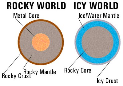 BASIC PLANETARY STRUCTURE: All planets aside from the smallest chunks and the gas giants have three layers, the core, the mantle and the crust. Lighter materials tend to end up in the crust and heavier, like metals, in the core, through the process of differentiation all larger chunks and planets go through. An inner zone planet with high density is thus likely to have it because it has a big metal core, not because all the material is composed by heavier elements. An inner zone planet with low density comparatively has a small metal core, or perhaps none at all. In the outer system metals are comparatively rare, so the core (heavy material) is likely to be silicates (rock) and the lighter crust and mantle more composed of ices, such as water, ammonia, carbon dioxide etc. CORE: The core of a world is the densest part. It may be molten or partly molten. Some small planets and chunks in the outer system may have a not-very defined core very similar to the mantle. Comparatively large cores may indicate that parts of the mantle has been blown off by early impacts during system formation. Outer system cores are typically made of silicates to a high degree. MANTLE: This part of the world lies outside the core but inside the crust. It can be molten, semi-molten or solid. In worlds in the inner zone, the mantle is generally a mix of silicates and metals, while in the outer system the mantle is commonly made of ices. CRUST: The surface region. Density of the crust is typically lower than the average density of the planet. In the inner system, crusts are typically silicate-based, while in the outer systems crusts are generally icy. The thickness of the crust vary with tectonic activity. Plate tectonics indicate a thin crust.