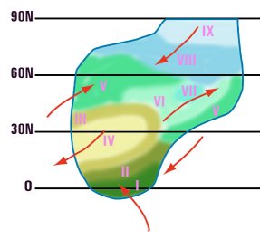Mountain climate depends upon their elevation (as temperatures drop with altitude) and location, and how dense the atmosphere is Airless worlds do not have much of climate zones (the effect on geomorphology and vegetation is certainly not mattering much), though they could be classed as glacial, cold arid or warm arid. A MODEL CONTINENT: The picture below shows an idealized and simplified continent on a world with a similar weather/ocean pattern and temperature as Earth. Using the dominant weather patterns, continent shapes (see NINE/2) and the temperatures this can be done for worlds in general.