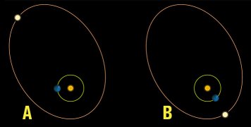 Example of "great seasons" in a binary system. The world orbits a smaller main sequence star, while a larger brighter companion is in an elliptical orbit many times longer than the planetary year. In A the other star is at almost furthest separation, and aside from the bright nights the effect on the world is not big. In B , closest separation, the star would have a much larger influence on local climate, and one of the suns would be up almost constantly. For the axial tilt-based seasons, the simplest way is to recalculate the "effective" latitude and then modify it. Lets assume that we are at 40 degrees latitude on a world with 20 degrees axial tilt. Thus, in the summer (when the sun is higher in the sky) the effective latitude is 40-20 = 20 degrees, while in the winter the latitude is 40+20 degrees = 60 degrees. Use the same moderation modifier as before for basic latitude temperature. Then, calculate the temperature difference for summer (by taking summer temperature-average temperature) and winter (by taking winter temperature-average temperature). These differences should be modified further depending on location and specifics of the world.