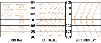 We understand that the rotation of the world is very important, a world that rotates half as fast as Earth has only half possible coriolis force. On a world with high wind speeds and fast rotation, like many gas giants, the coriolis force will be so strong as to form bands of east-west winds and no polar-equatorial winds. On worlds with a large axial tilt the coriolis force still works, but one has to consider that the area which receives the most solar infall seldom is at the equator but closer to the poles. The basic pattern of surface winds is very important to climate, as it not only moves cool air from poles and hot air from low latitudes, but also moves moisture from oceans.